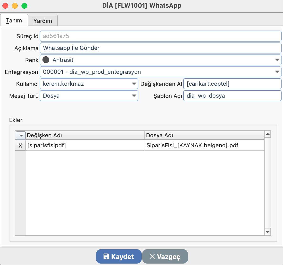 Entegrasyon: Sistemde tanımlı WhatsApp Entegrasyon Tanım bilgisi seçilir.