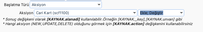 Aksiyon ile birlikte aksiyonun gerçekleştiği fiş/kart'a ait bilgilere ulaşmak mümkündür. KAYNAK sonuç değişkeni içerisinde bu bilgilere ulaşılabilir. Örneğin cari kartın _key bilgisine ulaşmak için [KAYNAK._key], cari kartın unvan bilgisine erişmek için [KAYNAK.unvan] gibi. Burada sadece işlemin yapıldığı ana tablodaki alanlara ulaşabilirsiniz (scf_carikart).