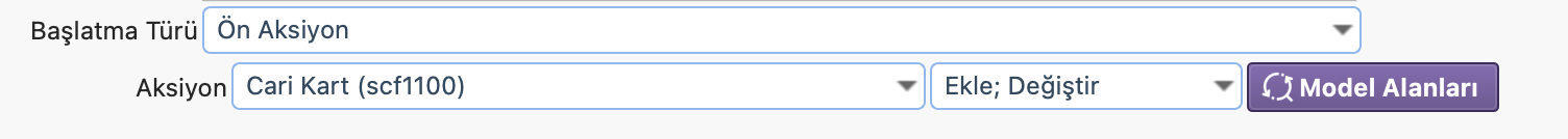 Başlatma türü olarak Ön Aksiyon seçildiğinde aksiyon listeleri açılır ve süreç, burada seçilen işlem tetiklendiğinde çalışır. Ön aksiyon süreçlerinin, aksiyon süreçlerinden farkı; kayıt işlemi yapılmadan önce devreye girmesidir. Bu sayede kaydetme, güncelleme veya silme işlemleri, süreç içerisinde gerekli kontroller yapıldıktan sonra gerçekleştirilebilir.