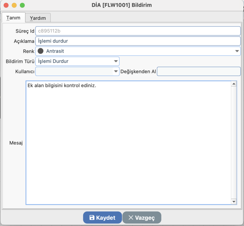 İşlemin durdurulmasının istendiği durumlarda Bildirim aracı eklenmeli ve İşlemi Durdur seçeneği seçilmelidir. Bu alana girilen mesaj, kullanıcı ekranında pop-up olarak görüntülenecektir.