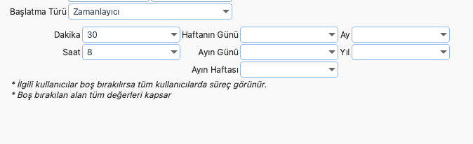 Süreç önceden planlanan bir zamanda çalıştırılır. Başlatma türü zamanlayıcı seçilirse açılan seçeneklerden tanım yapılır. Burada boş bırakılan değerler 'her zaman' anlamına gelir. Örneğin her sabah 8:30 da çalışmasını istediğimiz süreç için dakika alanında 30, saat alanında 8 seçeriz ve diğer alanları boş bırakırız.