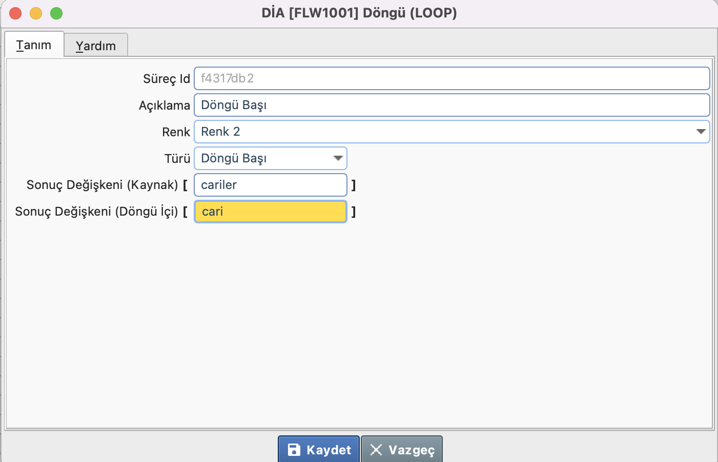 - Sonuç Değişkeni (Kaynak): Döngüde kullanılacak listedir, döngü öncesi sorgu alınıp bir değişkende tutulur. Örneğin [borclucariler], [odenmemisfaturalar], …