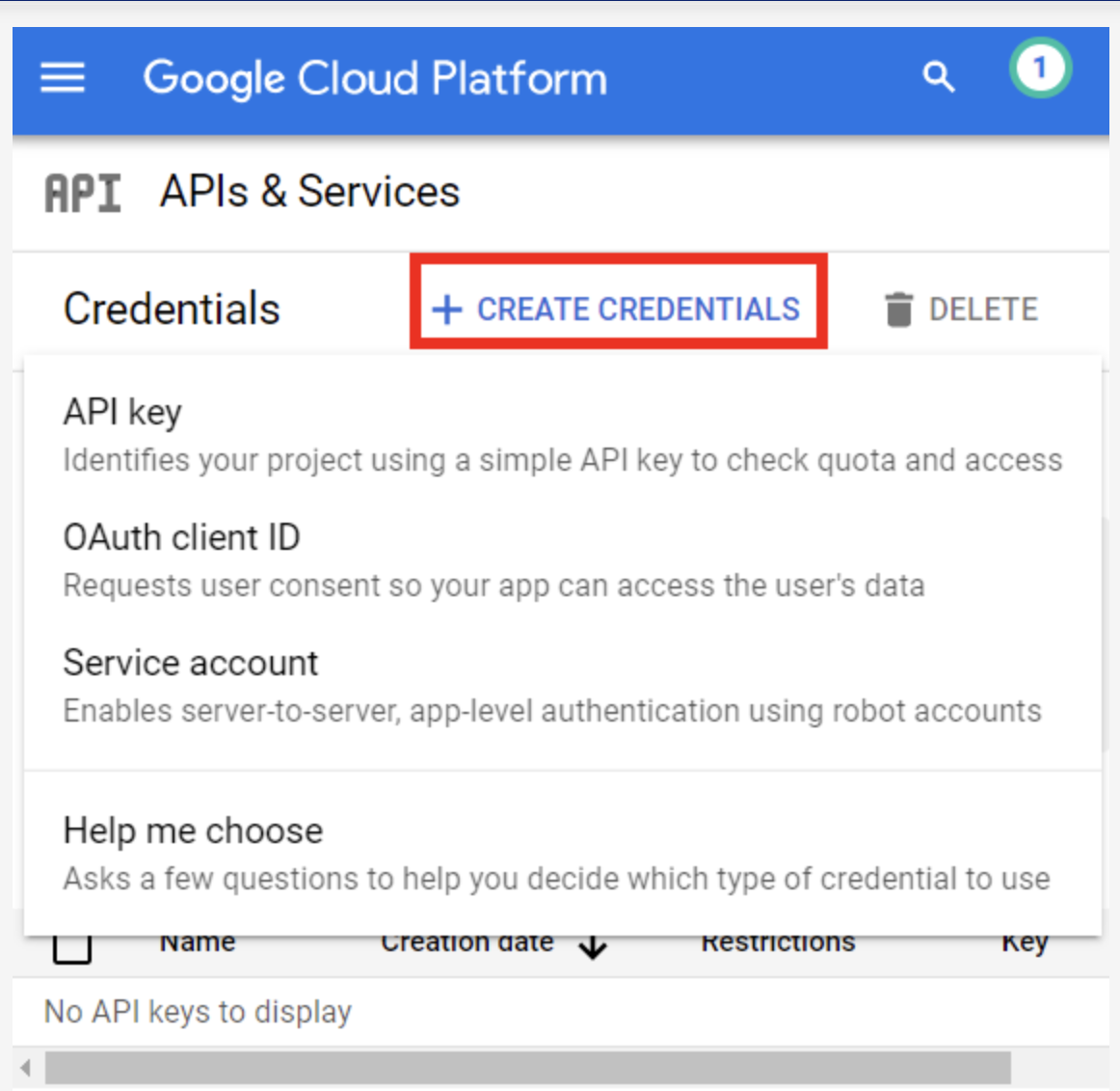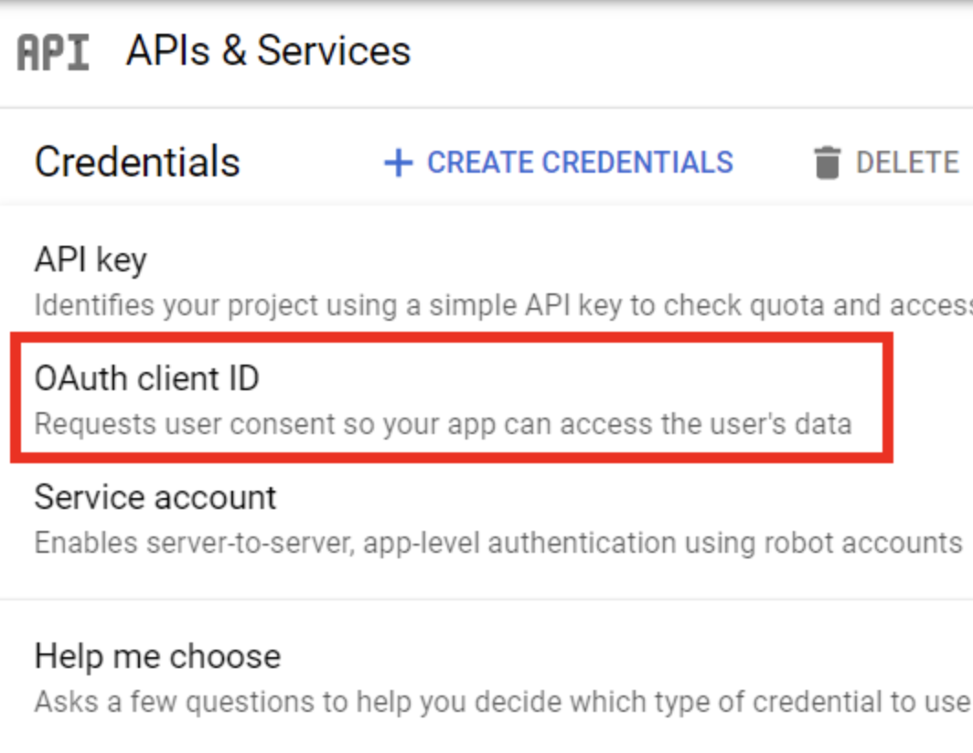 - 8.Adım: Soldaki Kimlik Bilgileri menüsüne tıklayın , ardından +Kimlik Bilgileri Oluştur'a tıklayın ve ardından OAuth İstemci Kimliği'ni seçin .