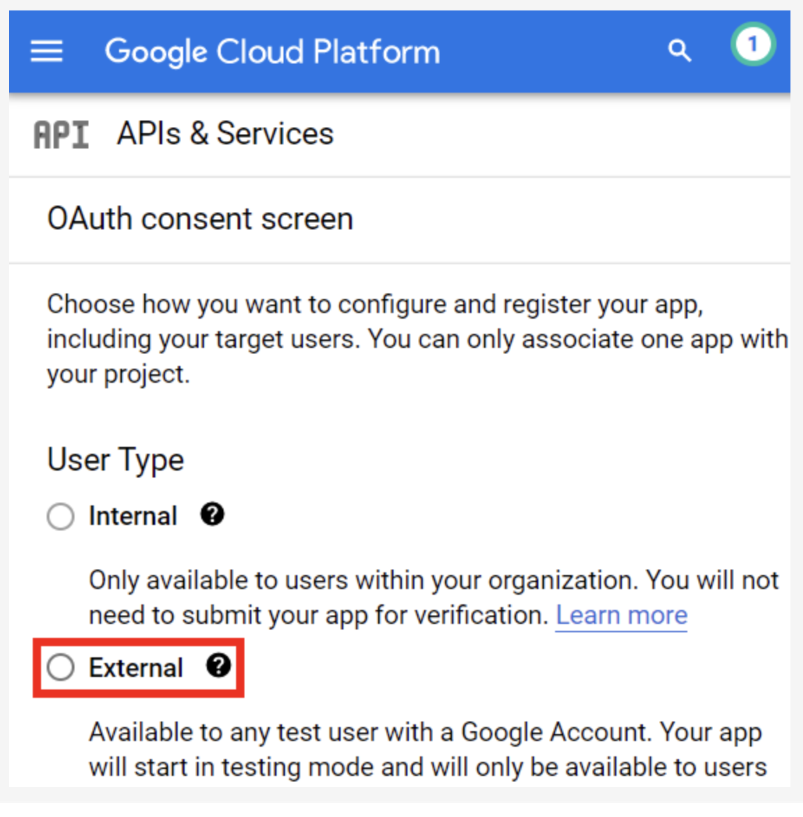 - 5.Adım: OAuth izin ekranında kullanıcı tipini belirtmemiz gerekmektedir. Harici seçerek oluşturunuz.