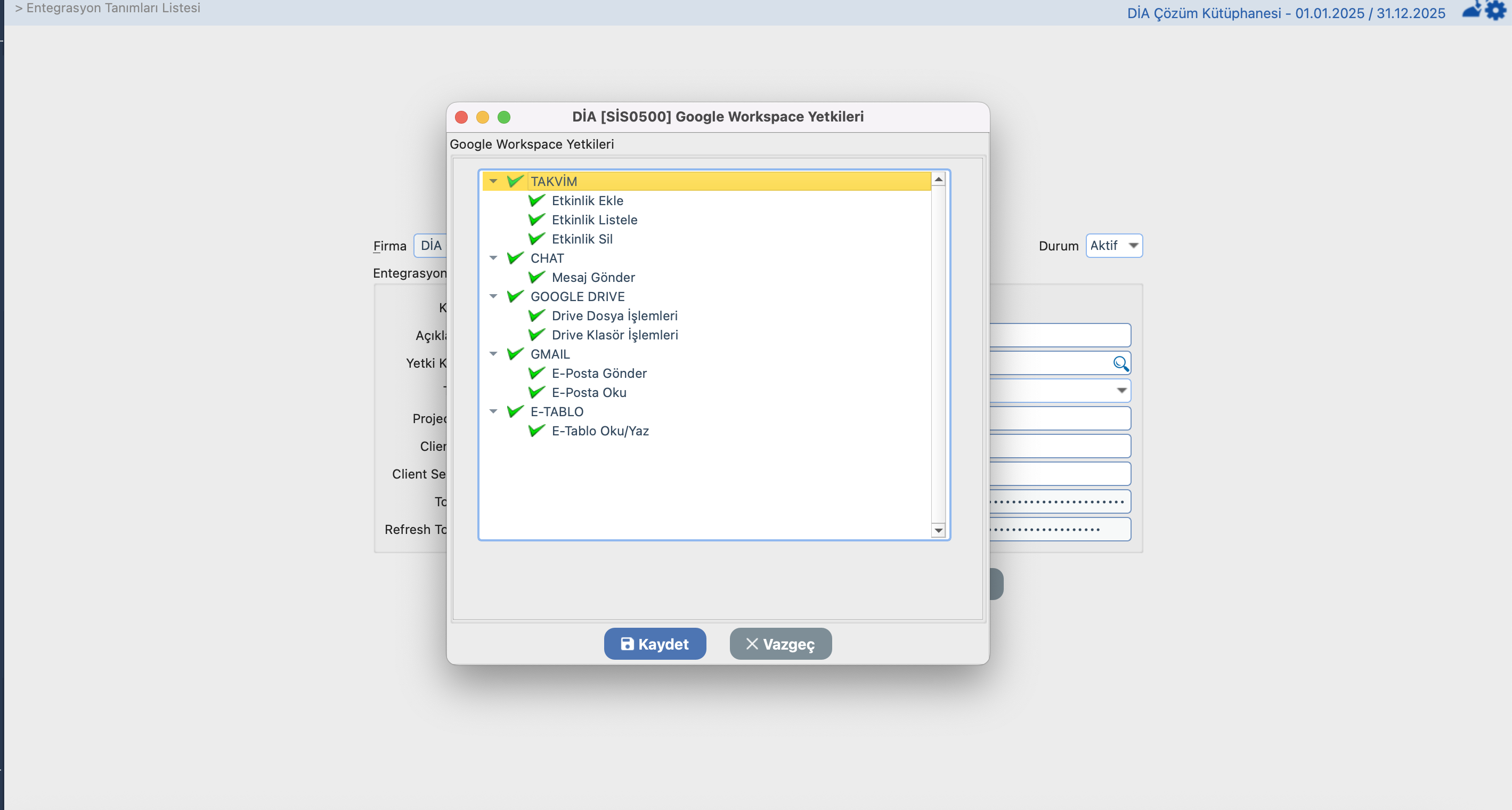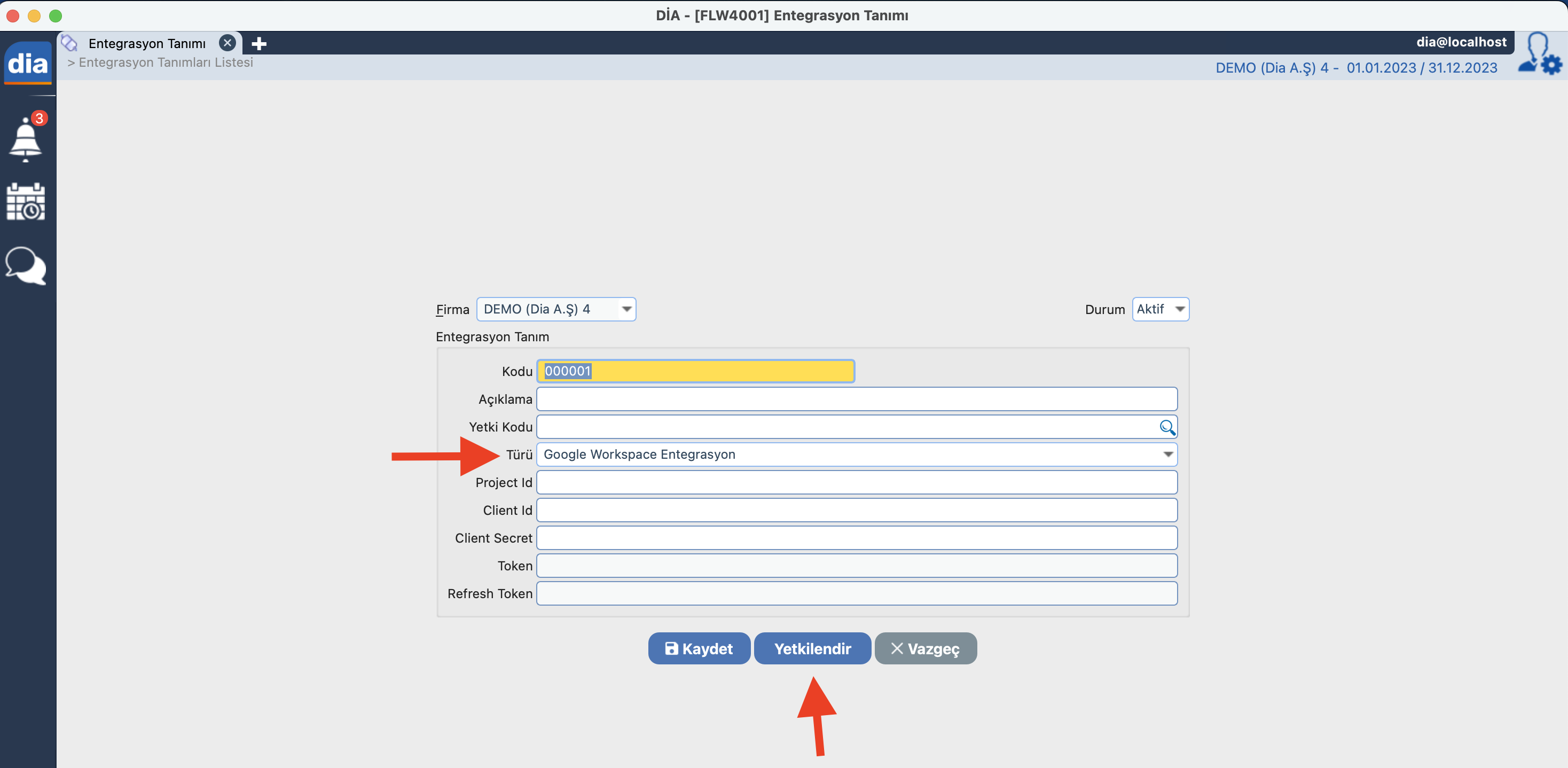 Adım 3: Tarayıcıda “Yetkilendirme başarılı” gibi bir mesaj görüntüleniyorsa, işlem tamamlanmıştır. DİA uygulamasına geri döndüğünüzde yetkilendirme ile oluşan token bilgileri otomatik olarak kaydedilir. Kaydet butonu ile entegrasyon tanımını kaydediniz.