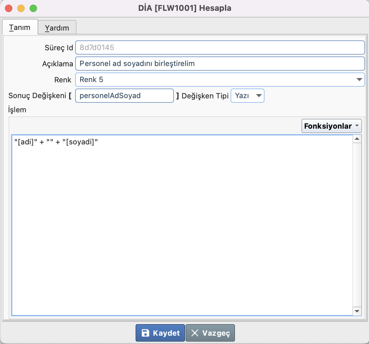 - İşlem: Bu alanda hesaplama formül değeri girilebilir. Aritmetik operatörler kullanılabildiği (+-/*) gibi, hazır fonksiyonlar da kullanılabilir. İşlemler içerisinde daha önce hazırlanmış olan sonuç değişkenlerini kullanabilirsiniz.