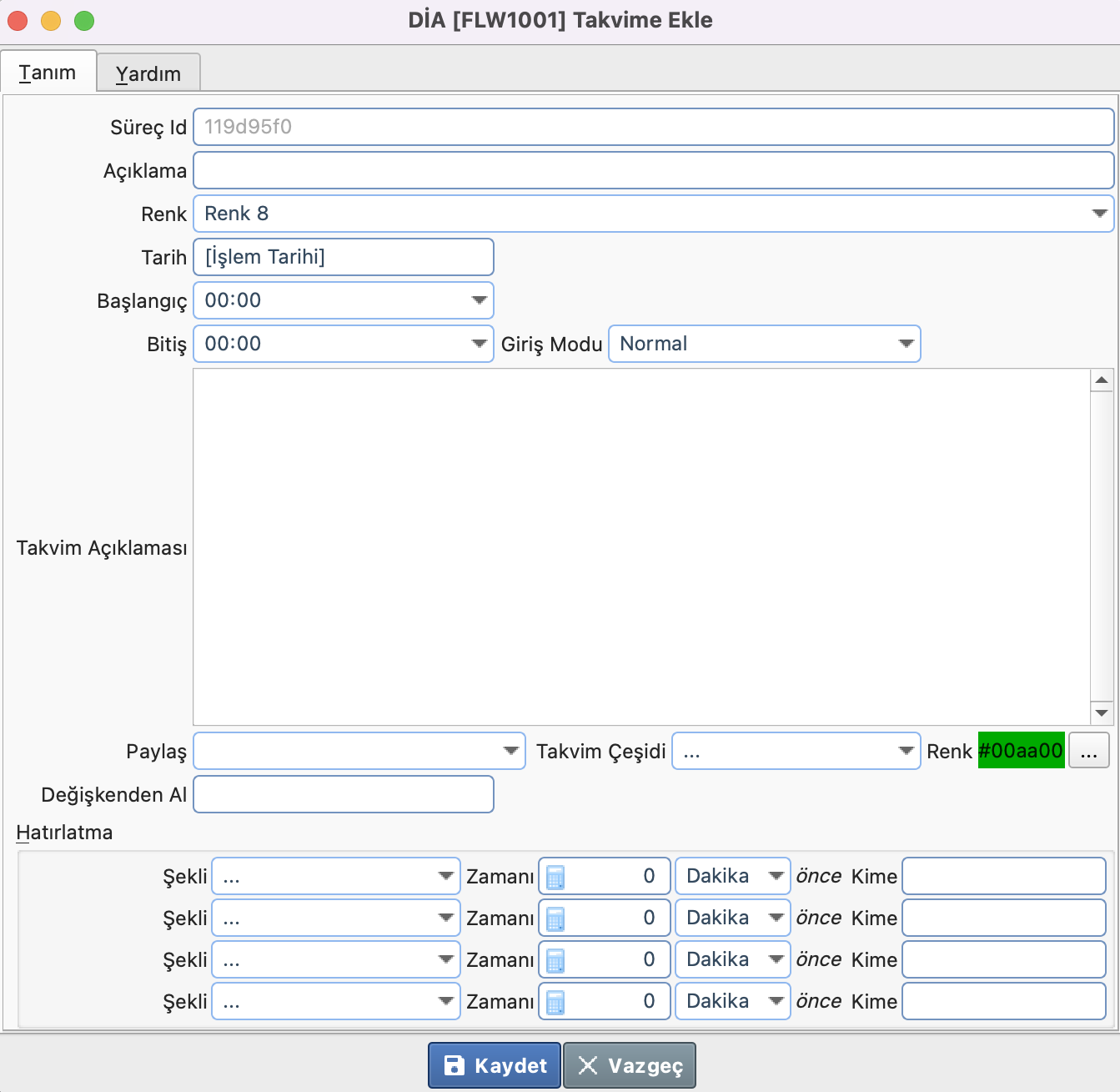- Giriş Modu: Normal modda saat aralığı kabul edilir. Tam gün modunda saatten bağımsız tam gün olarak takvimde girdi gözükür.