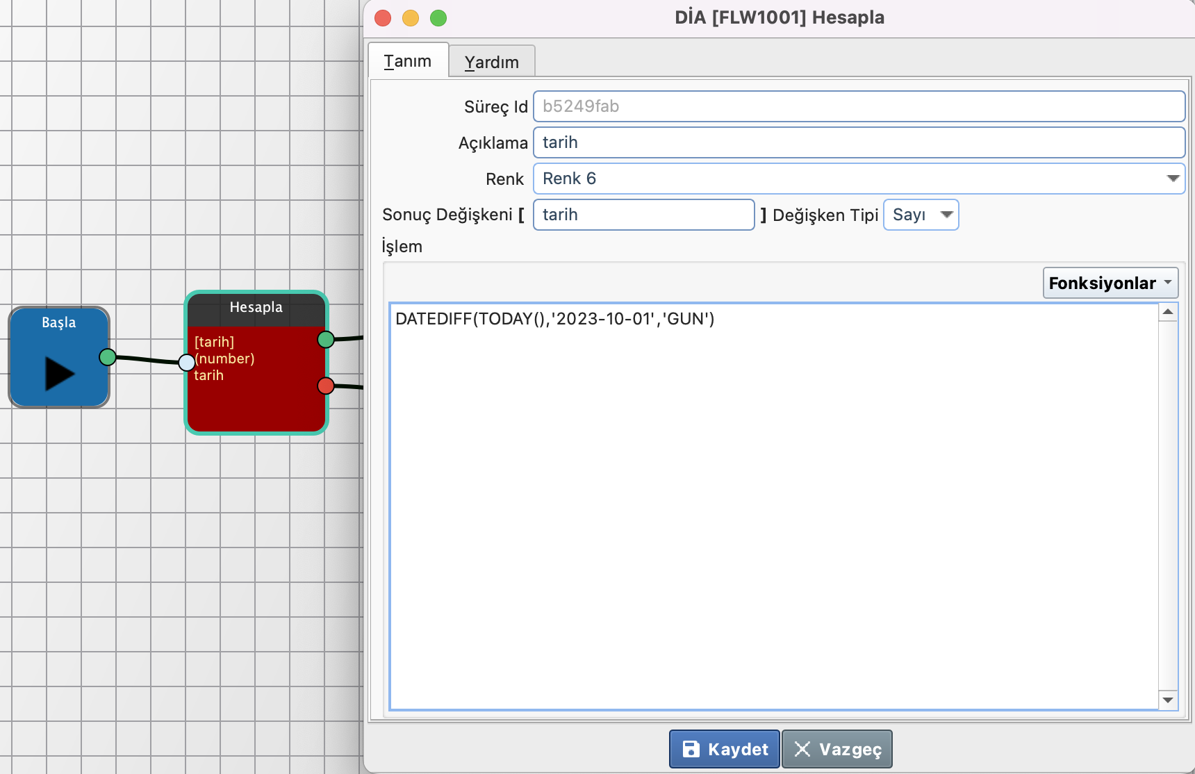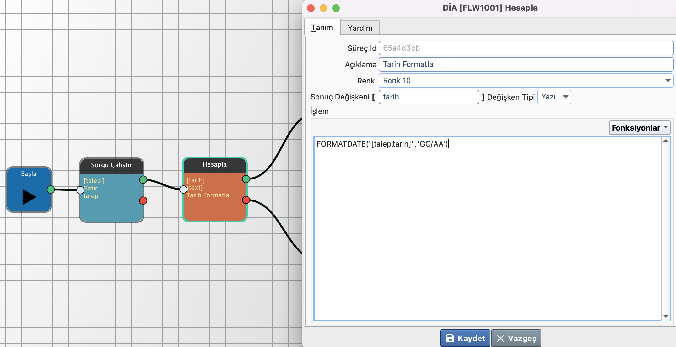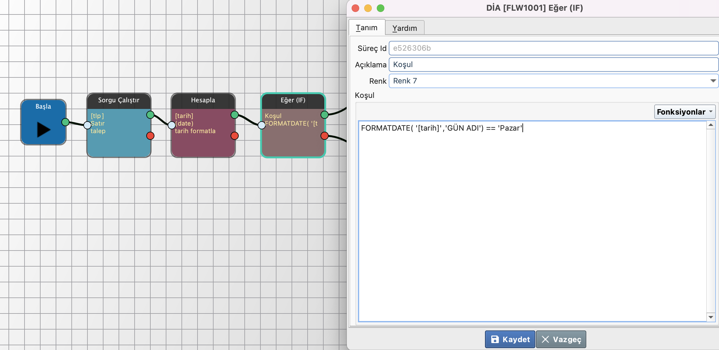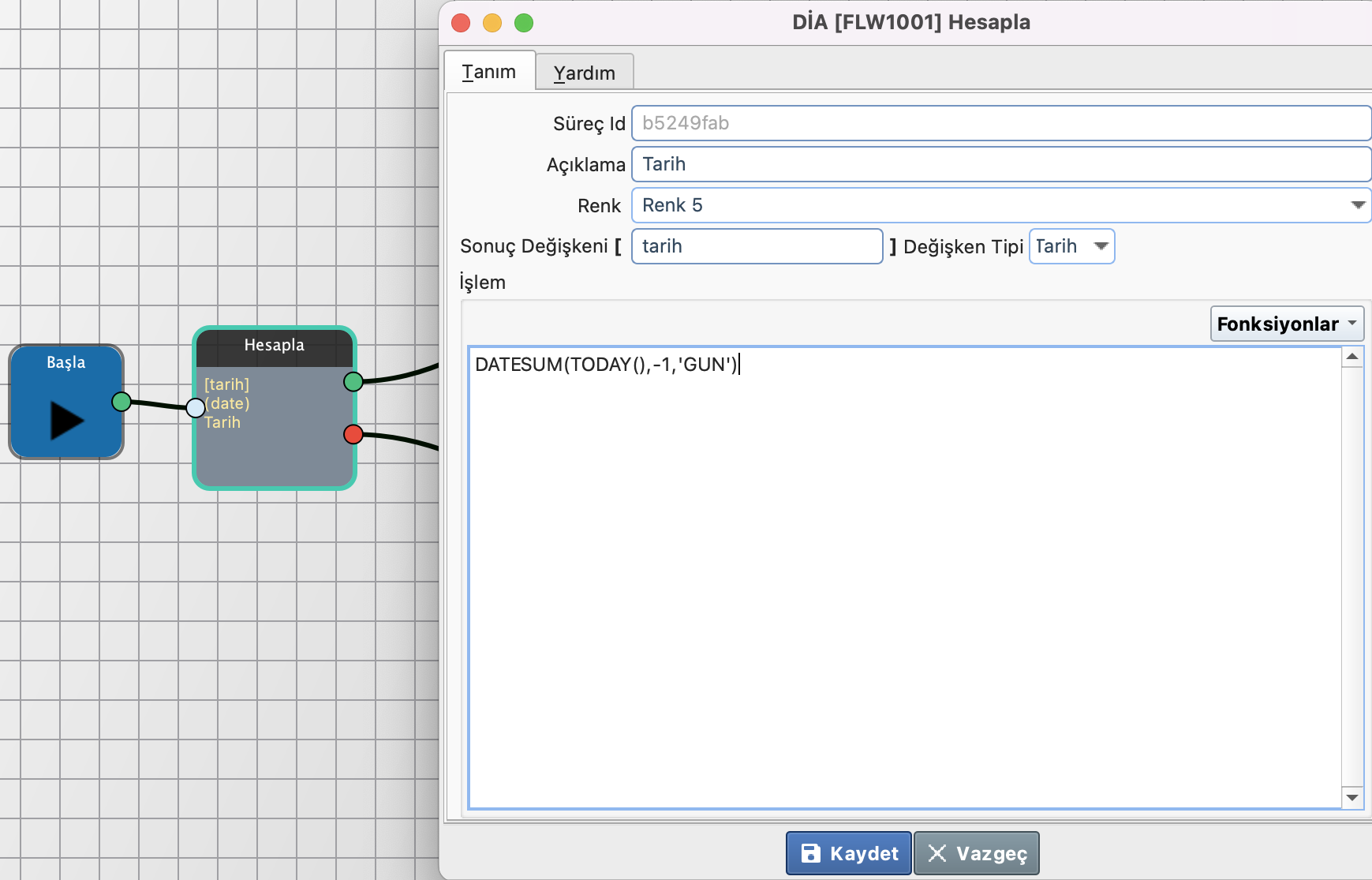 - DATESUM(date, value, valueType): Bir tarihten belirtilen miktar kadar öncesi ve sonrasını gene tarih olarak döndürür. valuType olarak “YIL”, “AY”, “HAFTA”, “GUN” seçilebilir. Örnek: