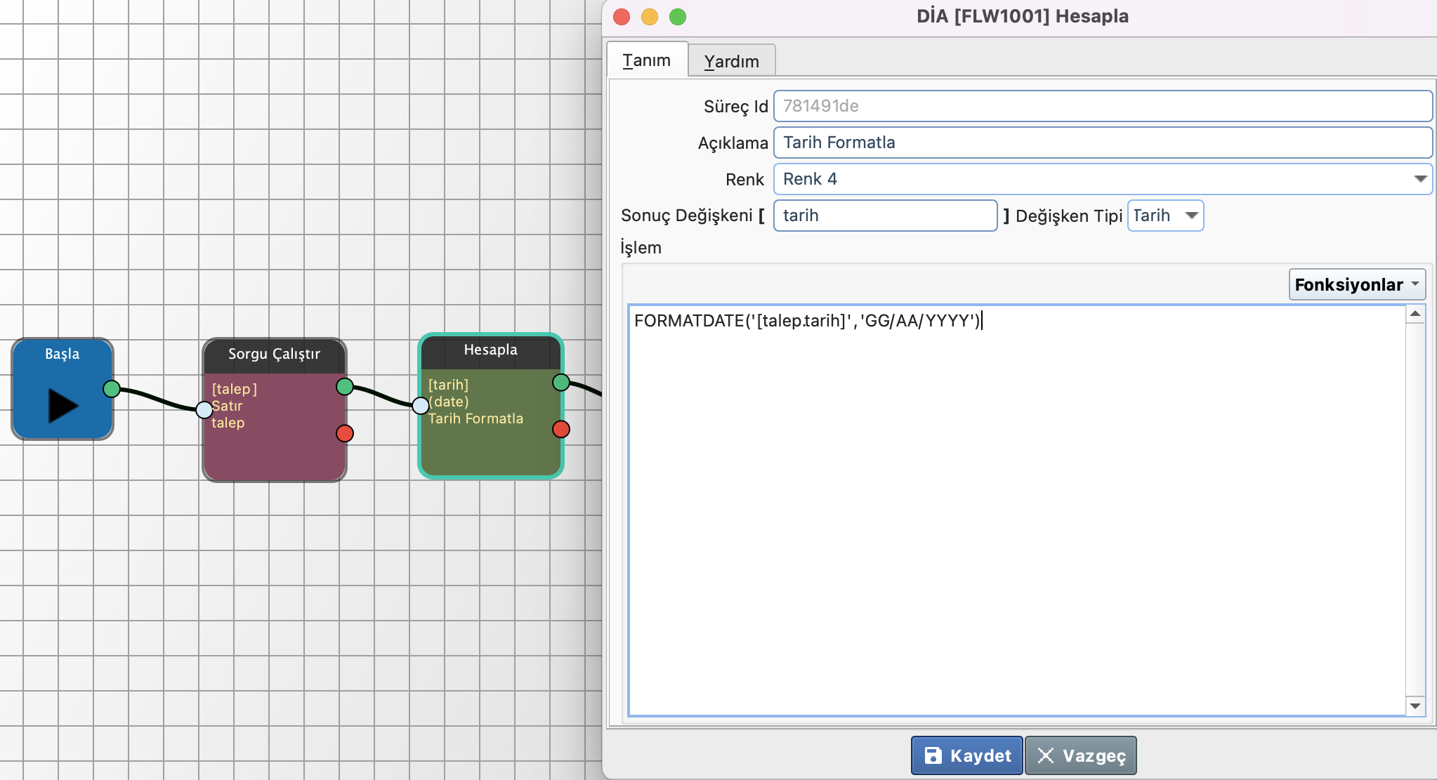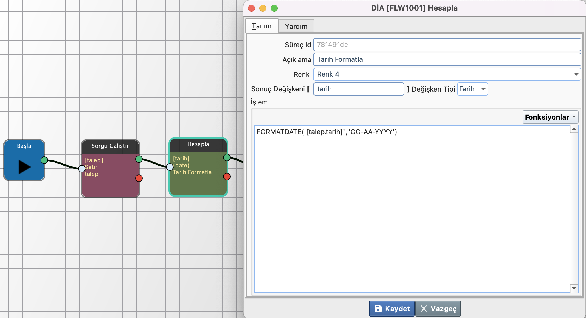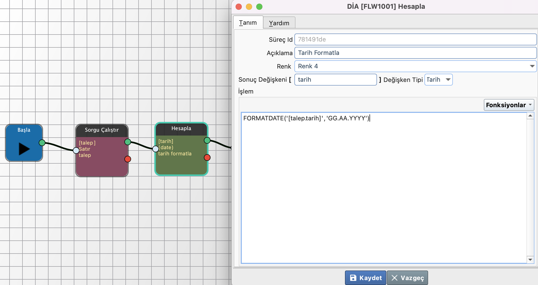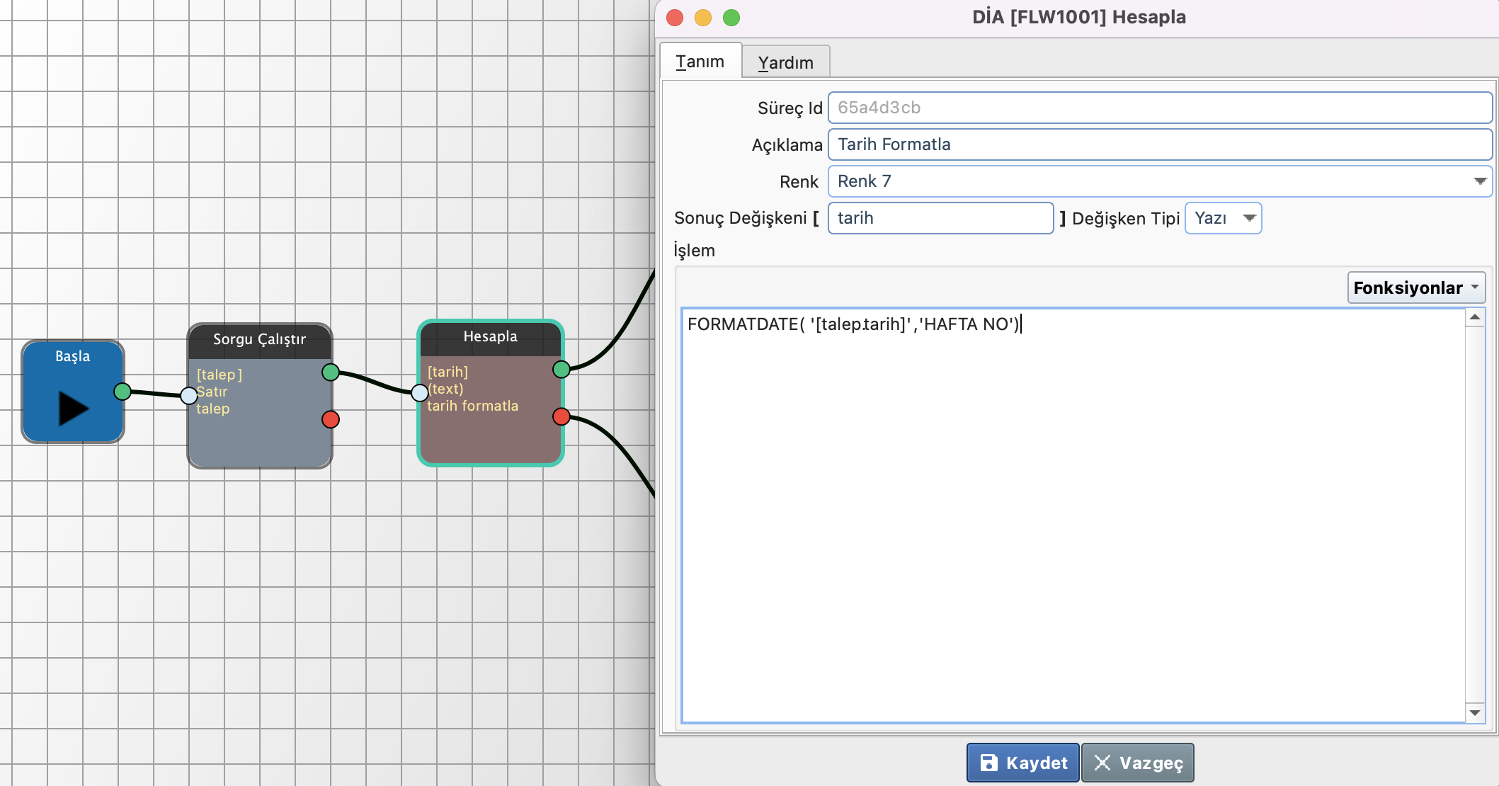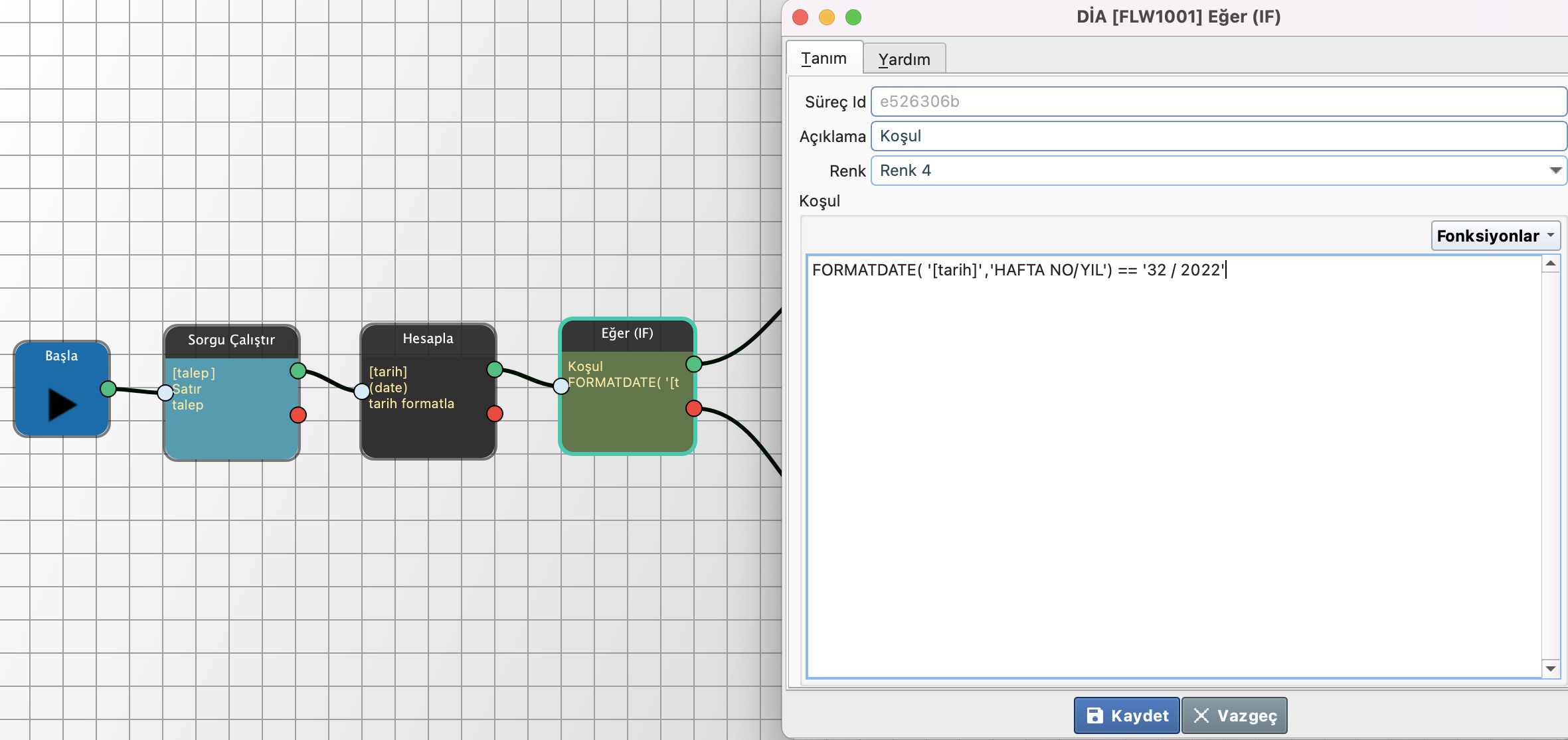 - DATESUM(date, value, valueType): Bir tarihten belirtilen miktar kadar öncesi ve sonrasını gene tarih olarak döndürür. valuType olarak “YIL”, “AY”, “HAFTA”, “GUN” seçilebilir. Örnek: