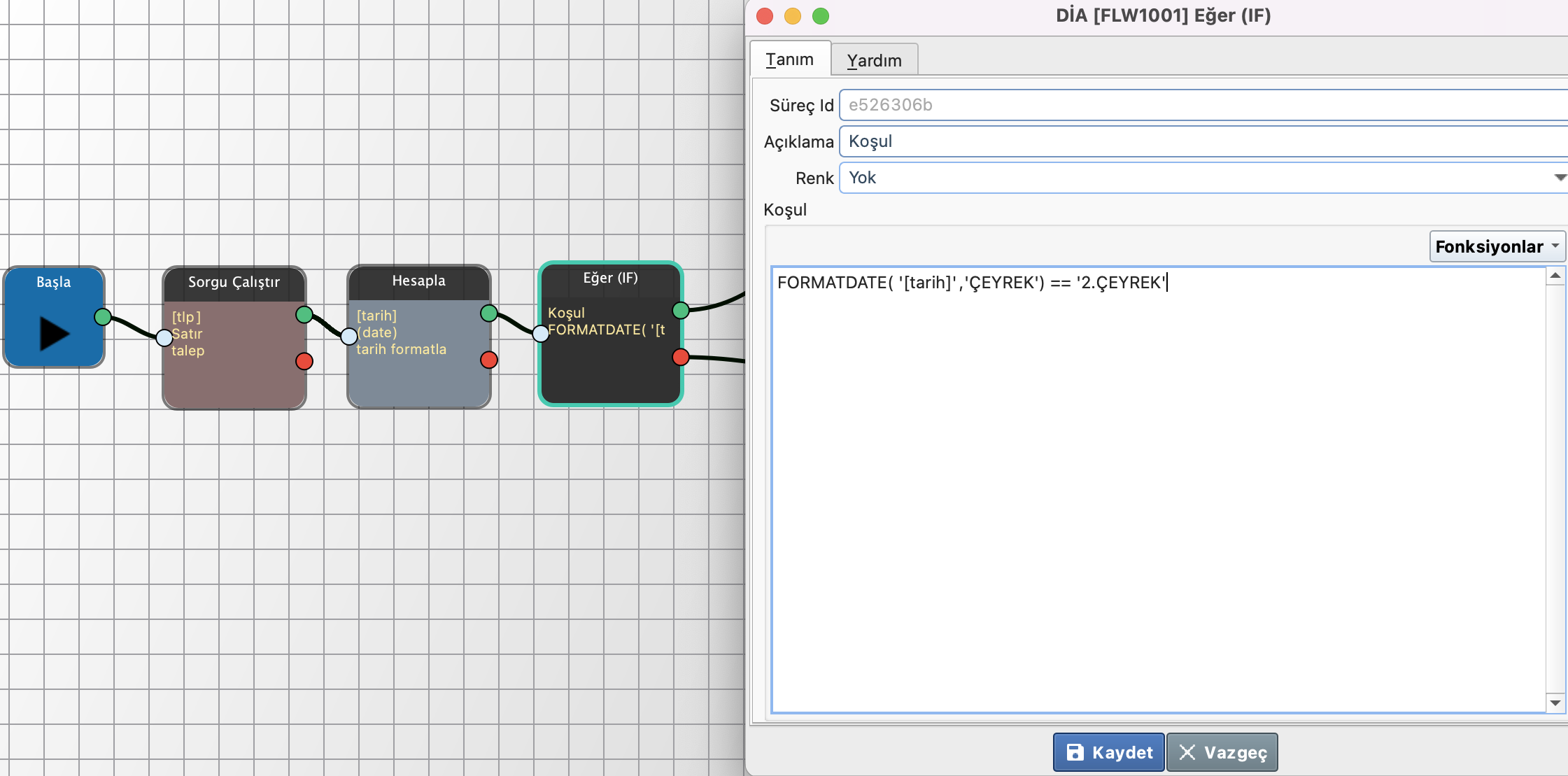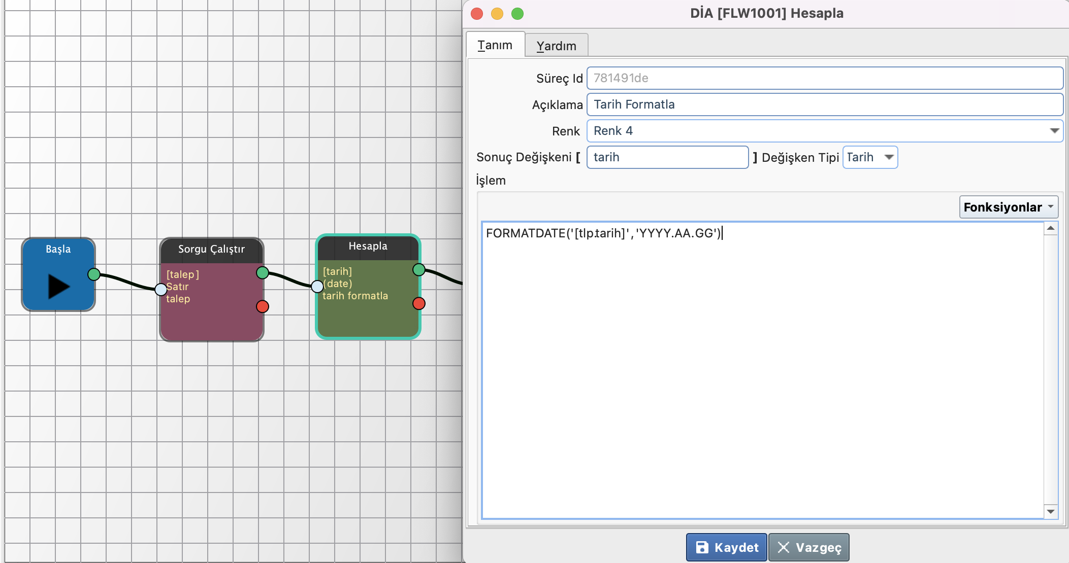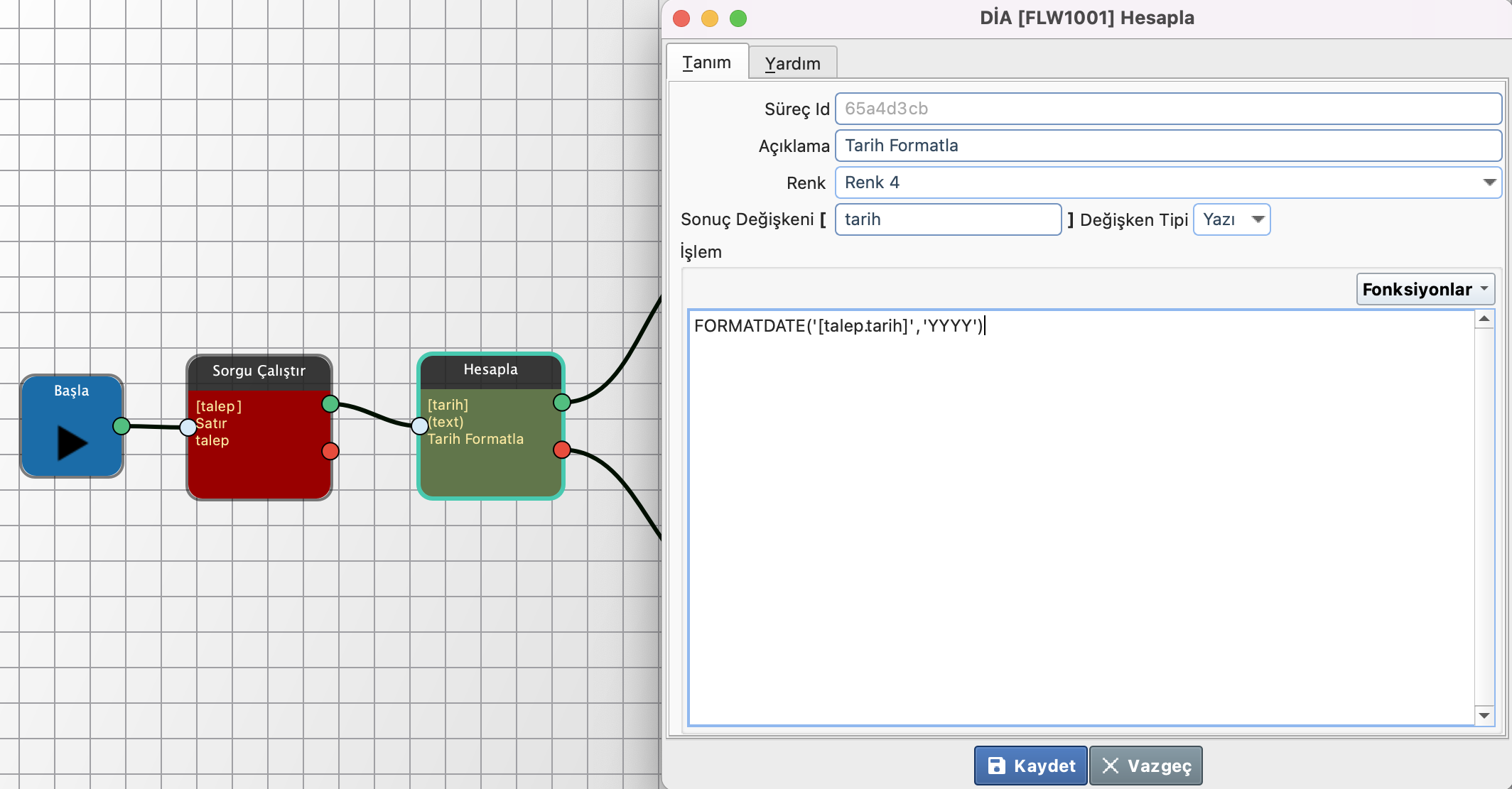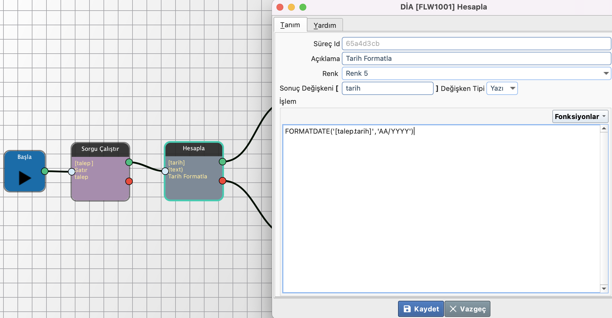 - DATESUM(date, value, valueType): Bir tarihten belirtilen miktar kadar öncesi ve sonrasını gene tarih olarak döndürür. valuType olarak “YIL”, “AY”, “HAFTA”, “GUN” seçilebilir. Örnek: