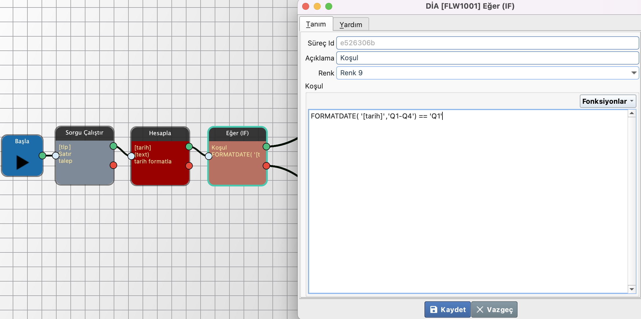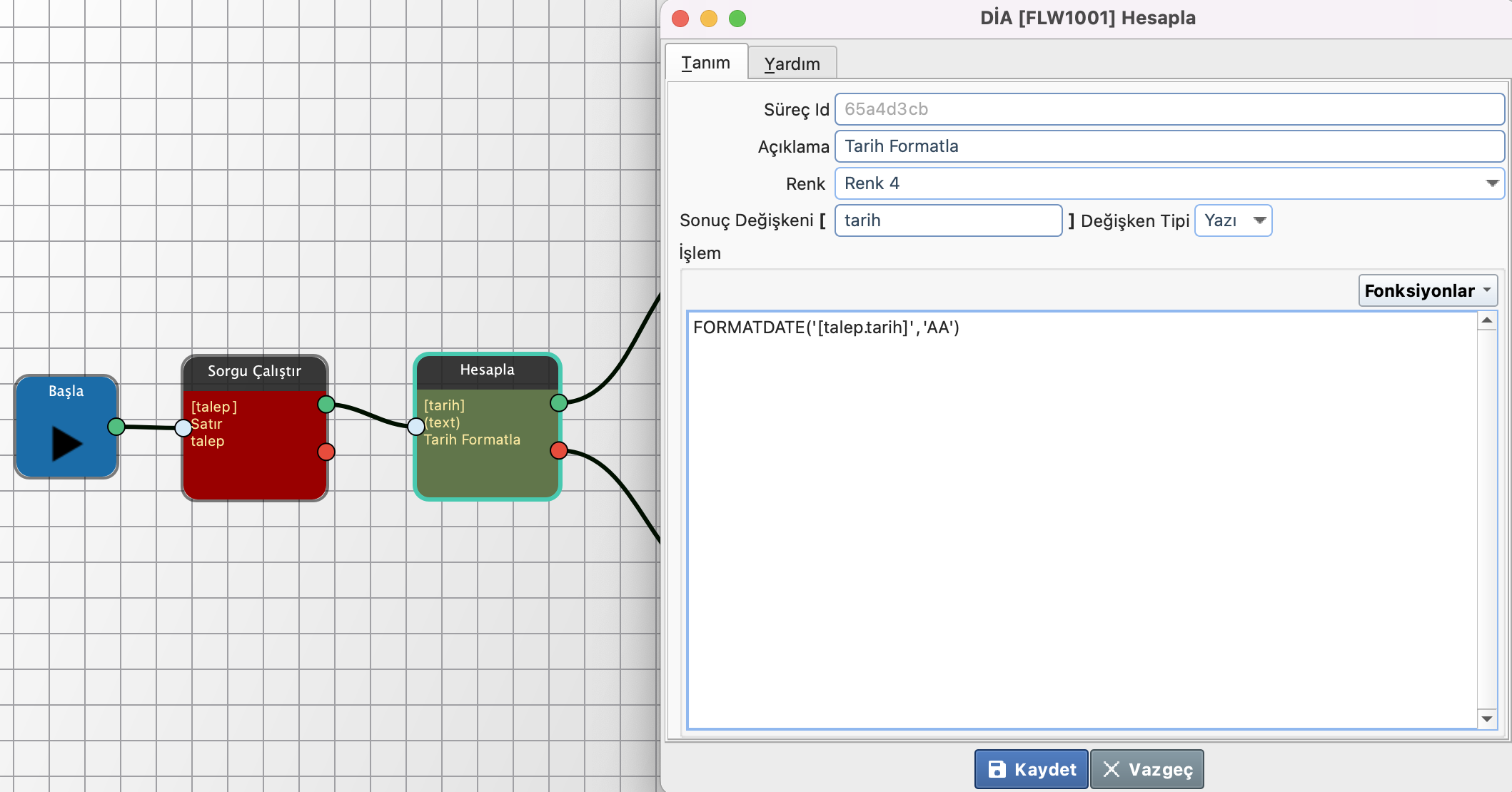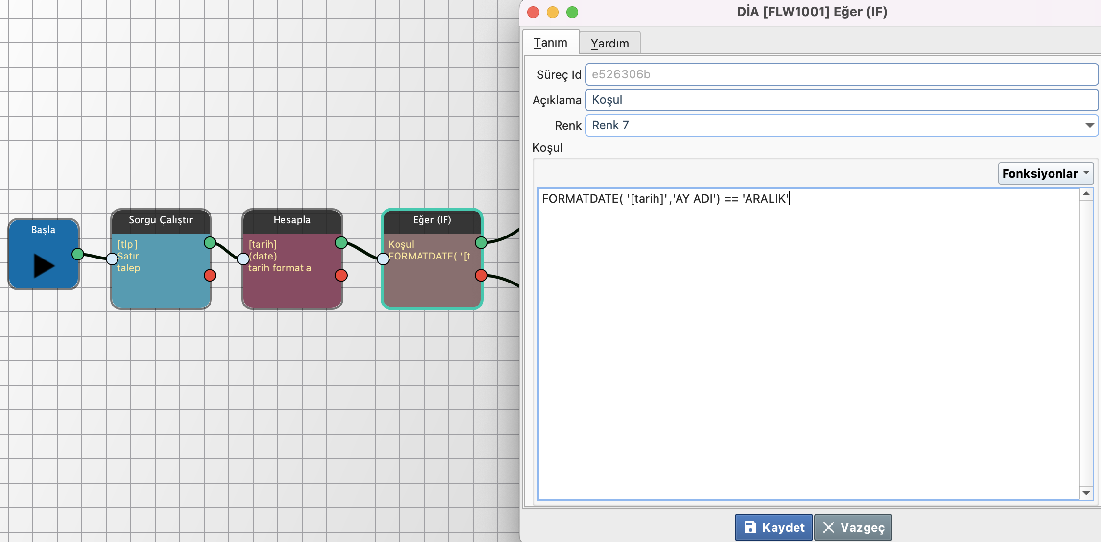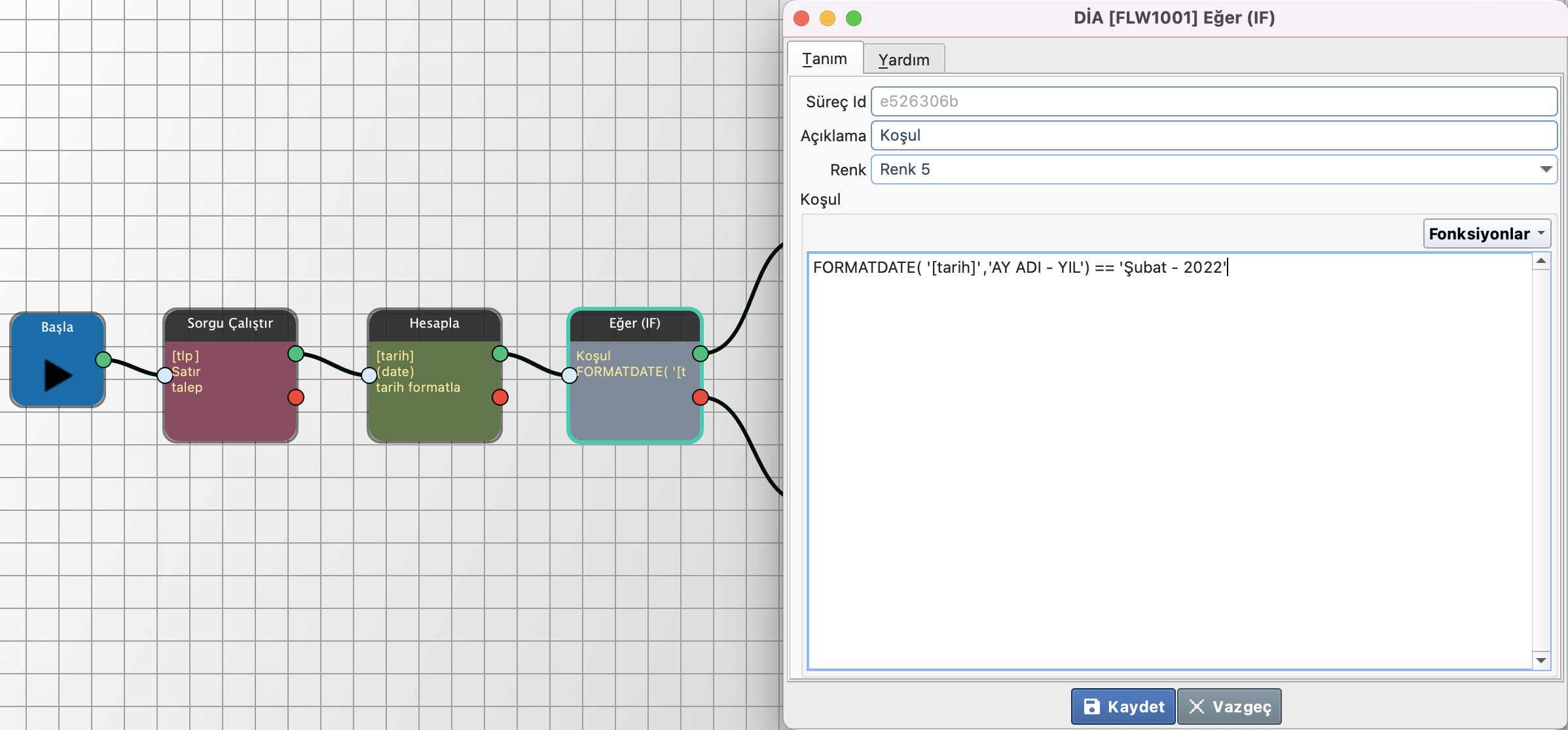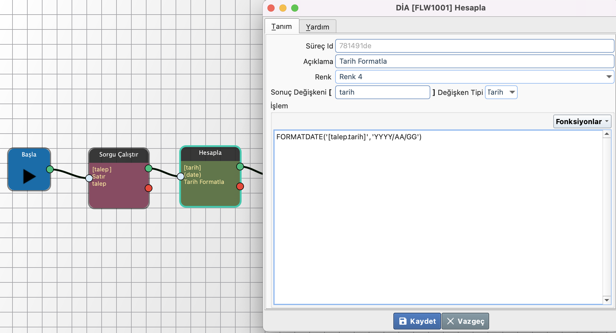 - DATESUM(date, value, valueType): Bir tarihten belirtilen miktar kadar öncesi ve sonrasını gene tarih olarak döndürür. valuType olarak “YIL”, “AY”, “HAFTA”, “GUN” seçilebilir. Örnek: