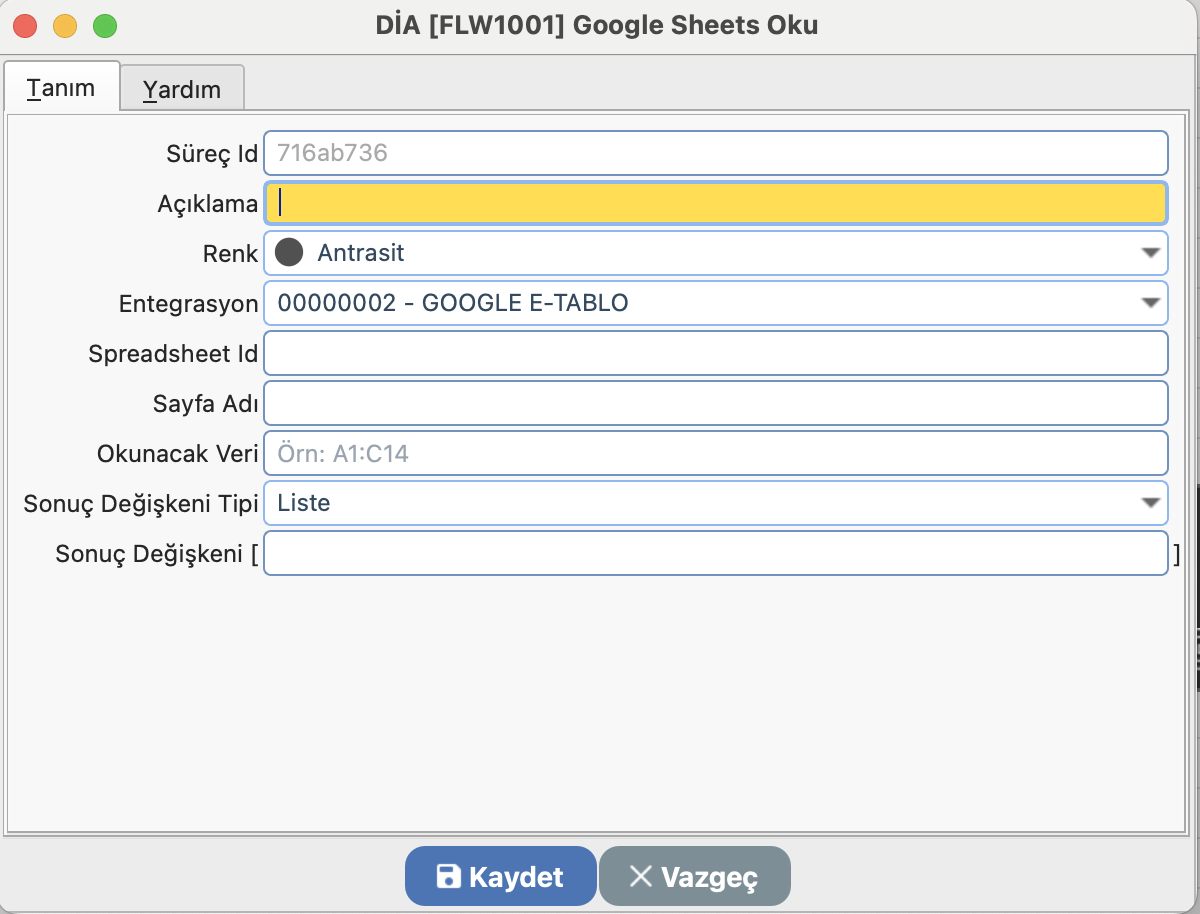 - Sonuç Değişkeni: Elde edilen verinin atanacağı değişken adıdır. Tanım [degiskenAdi] formatında yapılmalıdır.