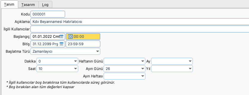 Örnek Senaryo: Her ayın 26'sında ilgili kullanıcılara beyanname ödemesinin unutulmaması için hatırlatma mesajının gitmesi istenmektedir.