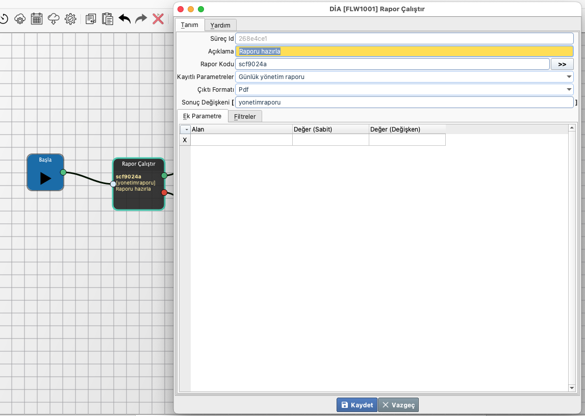 3. Adım: Rapor çalıştır adımı eklenir ve hazırladığımız tasarım seçilir. Çıktı formatı Pdf seçilir ve sonuç değişkeni tanımı yapılır.