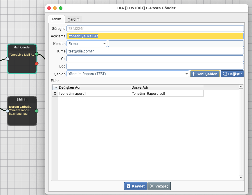 5. Adım: E-Posta gönder adımı eklenir. Uygun bir mail şablonu hazırlanır ve seçilir. Ekler kısmında önceden hazırlamış olduğumuz rapor değişkeni ve mail ekinde gözükmesi istenen dosya adı bilgisi girilir.