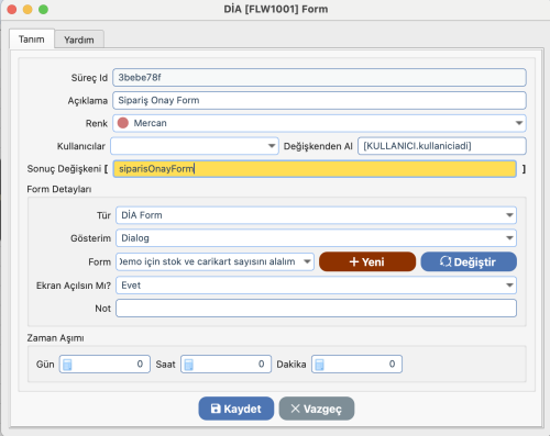 - Süreç tasarım ekranında bu değişken, karar/koşul adımlarında kullanılır.