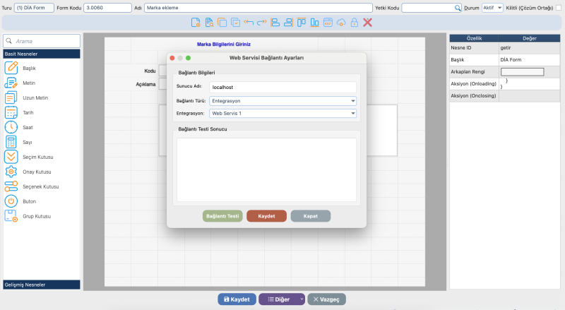 Form tasarımında DİA Web Servislerini çağırmak için iki adım gerekir: önce DİA Web Servis Bağlantıları ekranından bağlantı bilgilerinin tanımlanması, ardından Script Yöneticisi içindeki Web Servis adımı ile örnek JSON yapıları kullanılarak ekleme, güncelleme, listeleme ve getir işlemlerinin yazılması gerekmektedir.