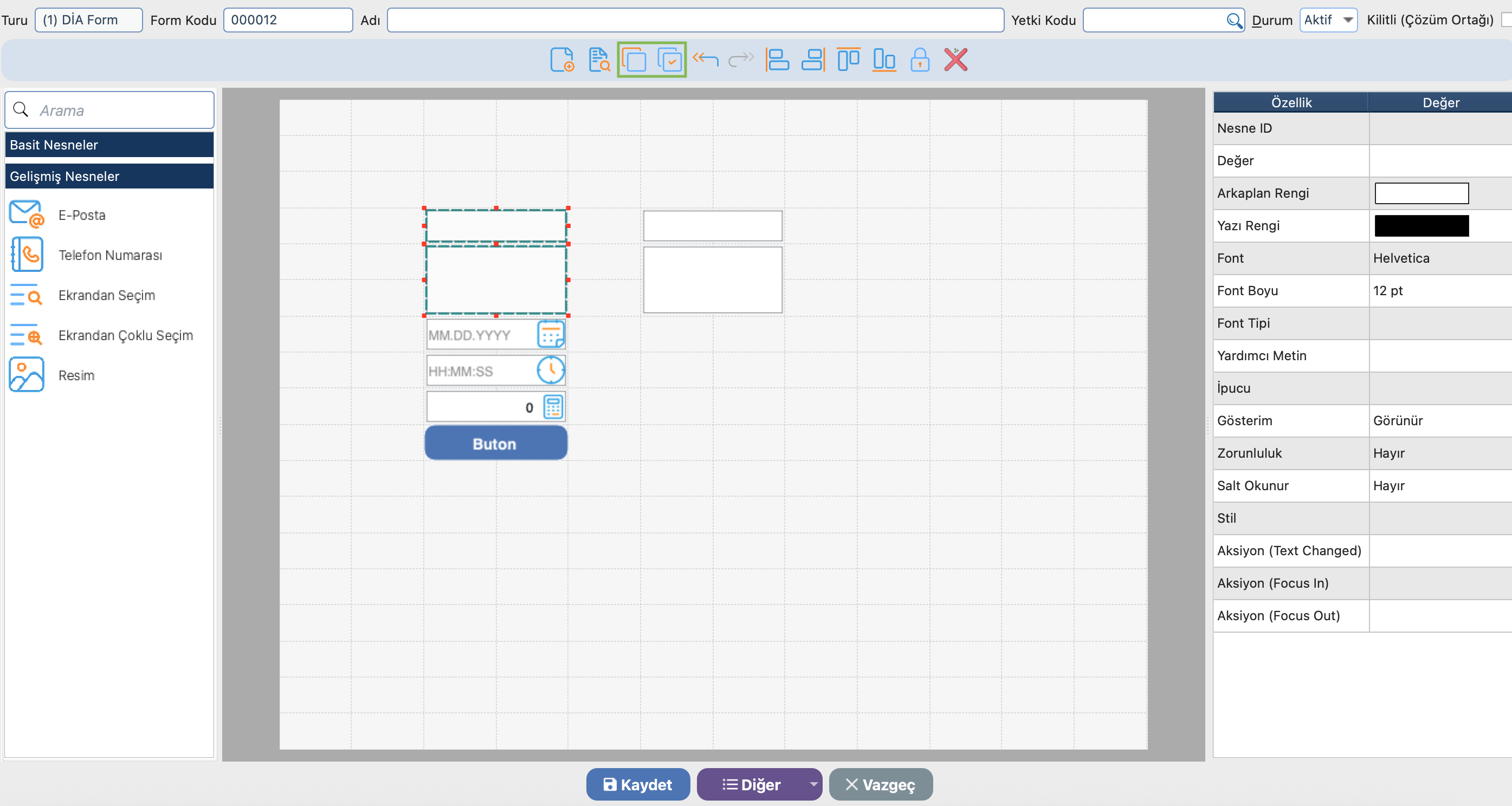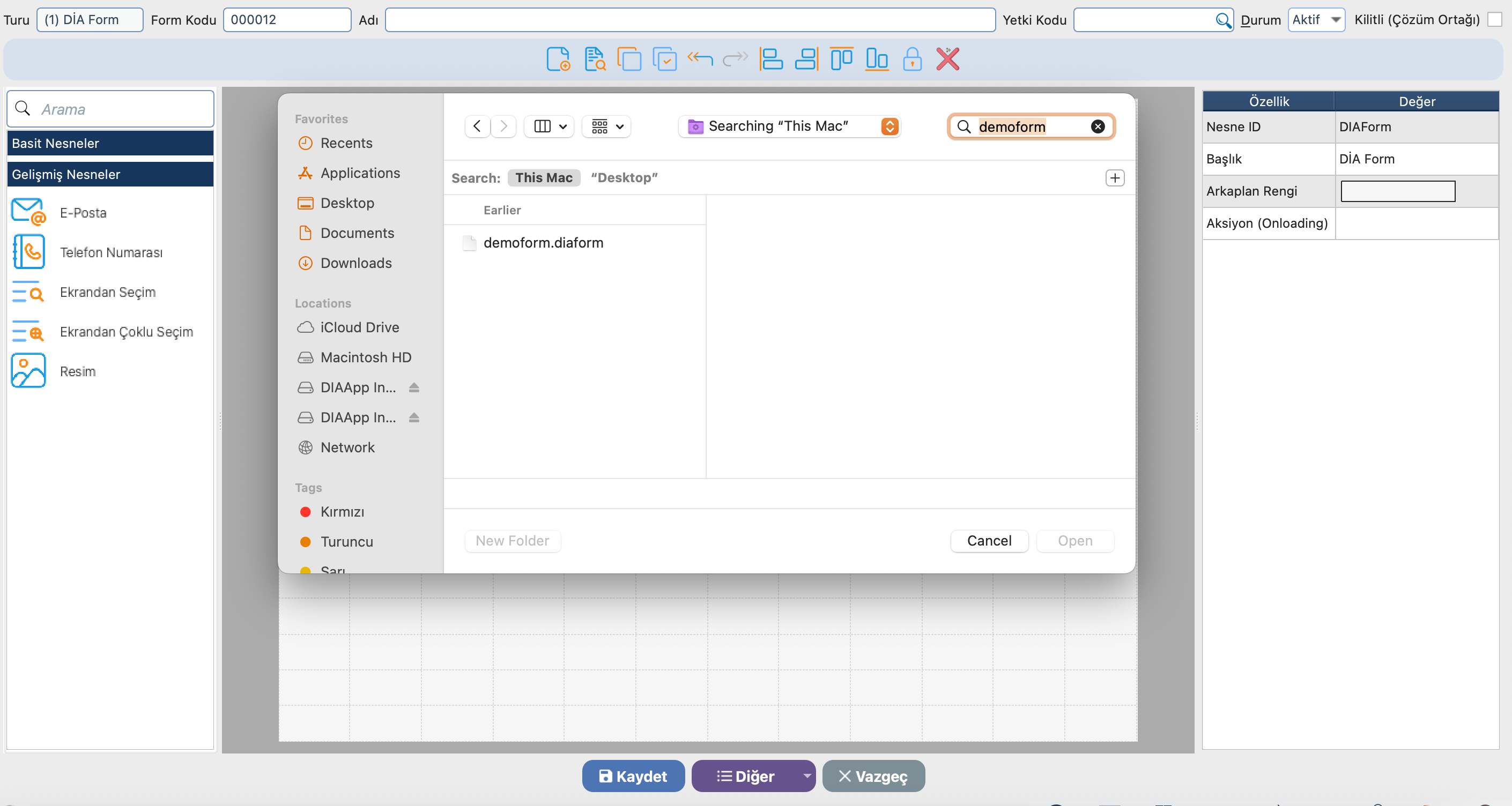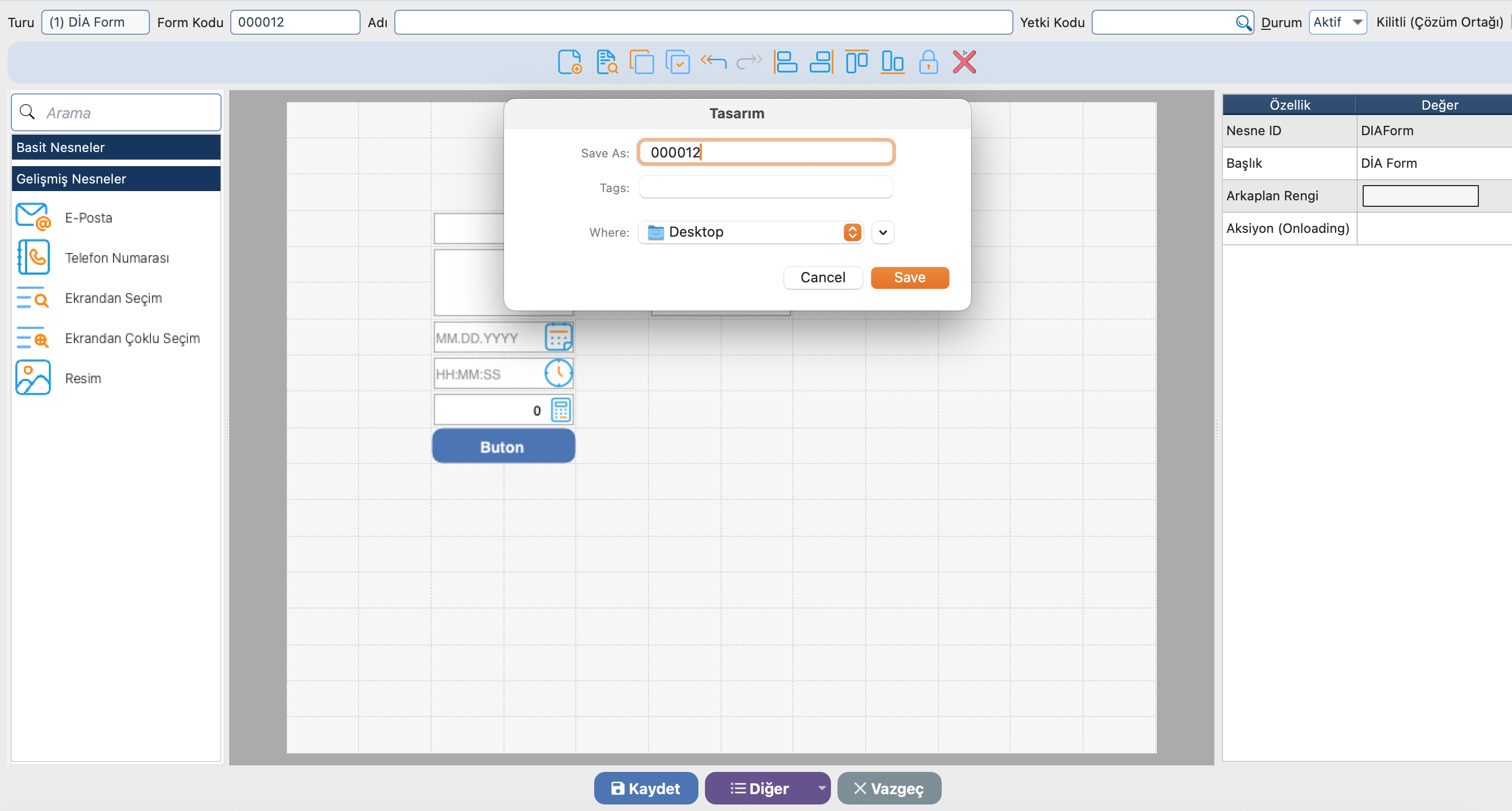 Tasarım editöründe yer alan diğer butonu içerisinde yer alan tasarımı Tasarımı Dışarı Aktar(Dosyaya) ile belirtilen dosya üzerine .diaform formatı ile kayıt işlemi sağlanmaktadır.